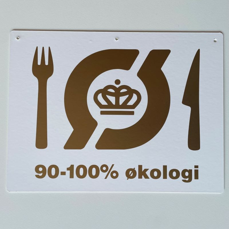 Papskilt med Det Økologiske Spisemærke – guld 90-100% til ophæng og indramning. Når I arbejder med økologi i jeres køkken, kan I gøre jeres gæsterne, kunder og medarbejdere opmærksomme på økologi og Det Økologiske Spisemærke med klistermærket.