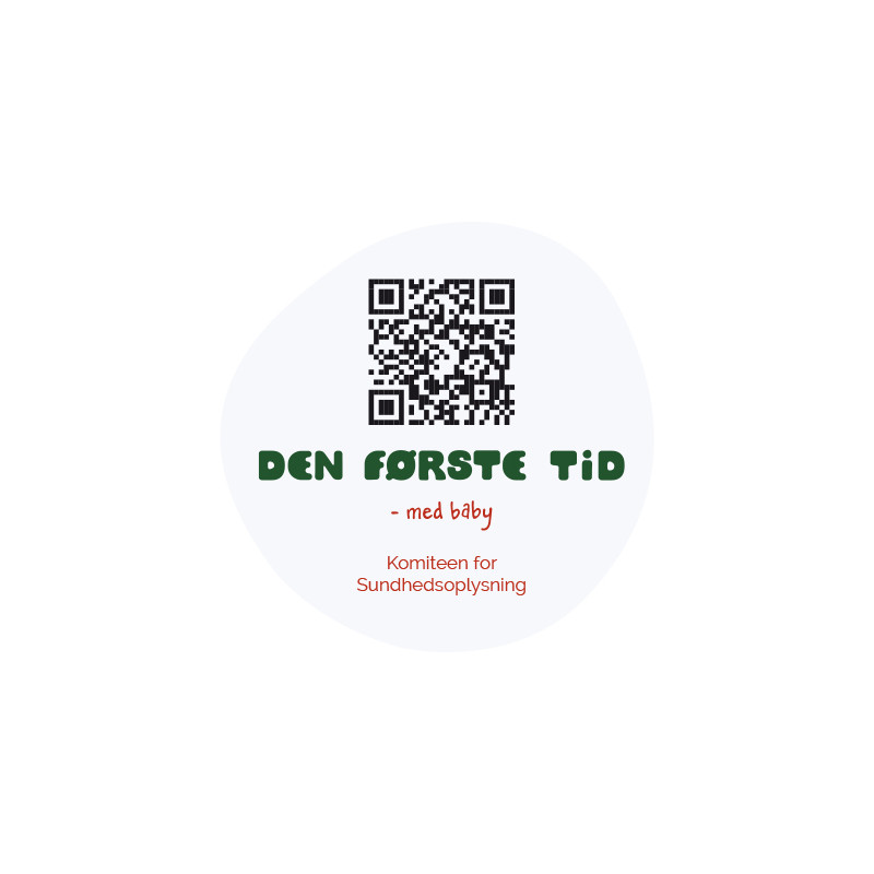 Klistermærke med logo og QR-kode til denførstetid.dk. Kan placeres synligt i konsultationer, på arbejdscomputere eller andet, hvor forældre nemt kan scanne og finde viden – et bæredygtigt alternativ til print.